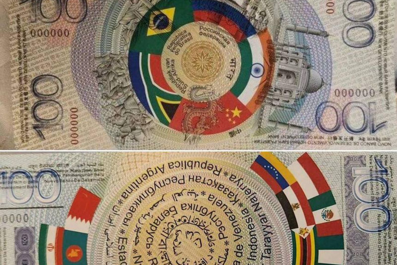 Na face frontal da nota, estão ilustradas as bandeiras dos países fundadores do bloco: Rússia, China, Índia, Brasil e África do Sul.
